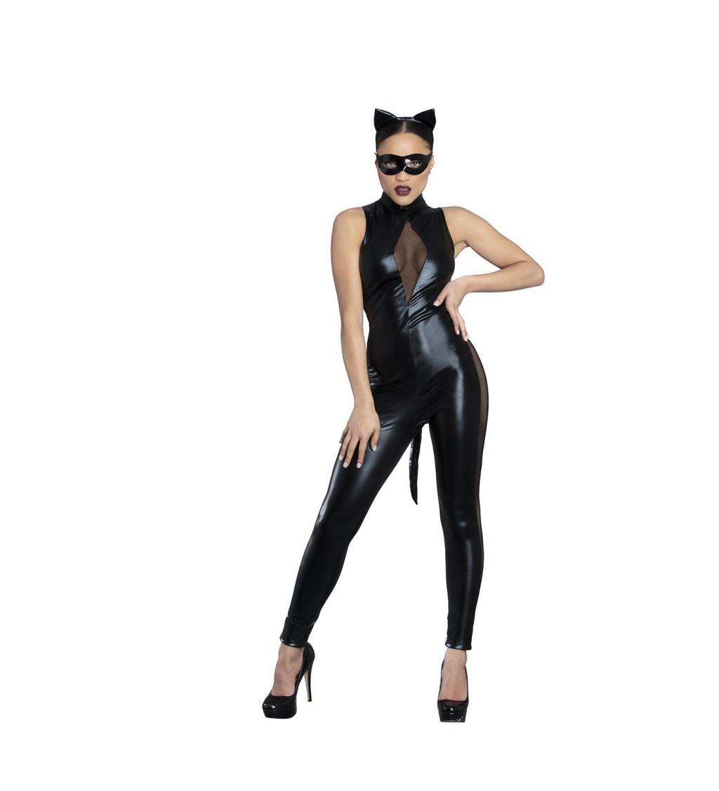 Kostým obsahuje odnímatelný ocas, masku na oči a čelenku s kočičíma ušima.