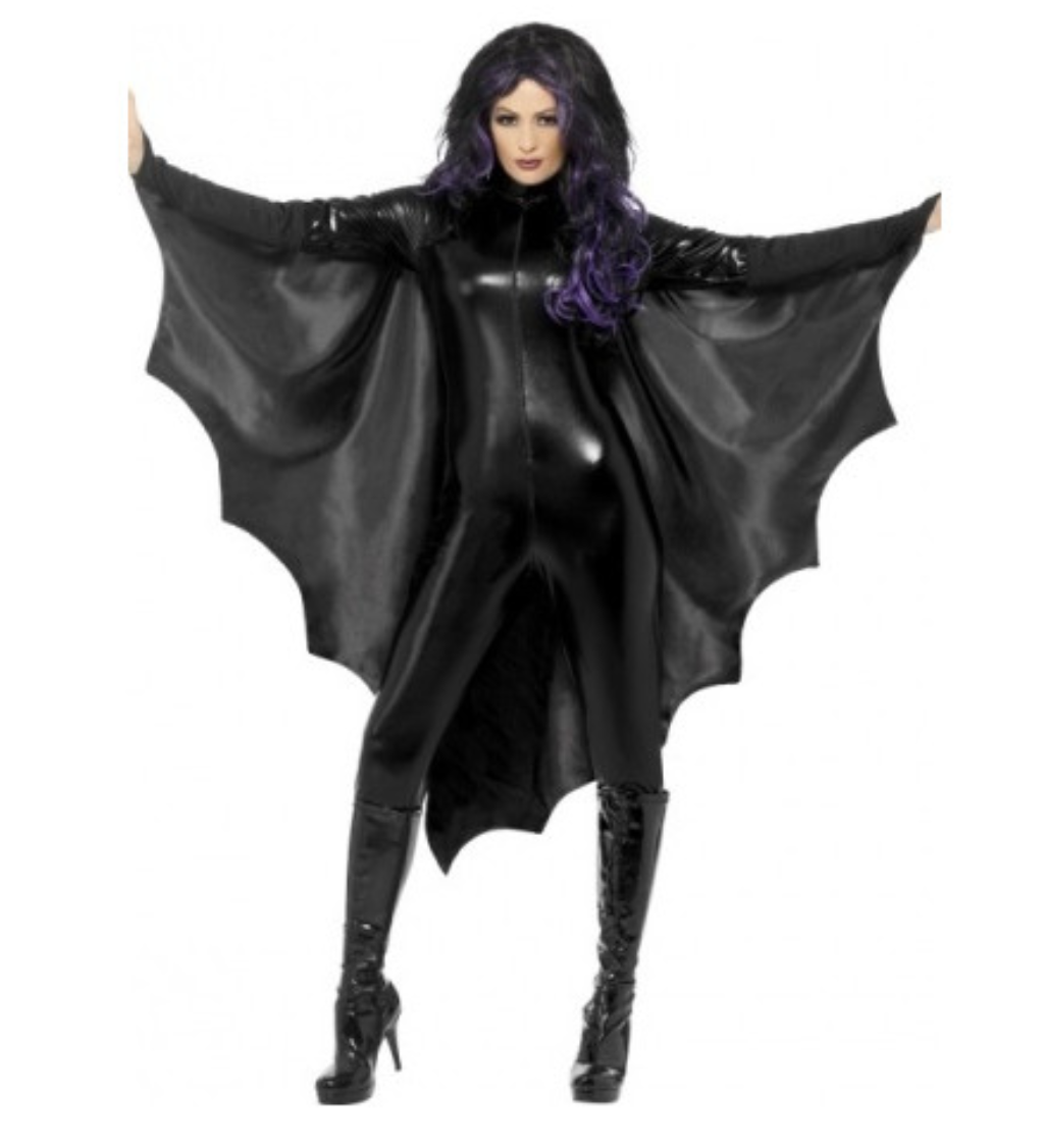 Černý plášť s límcem pro netopýra, který se navléká na ruce. Tento kostým je vhodný na Halloween.