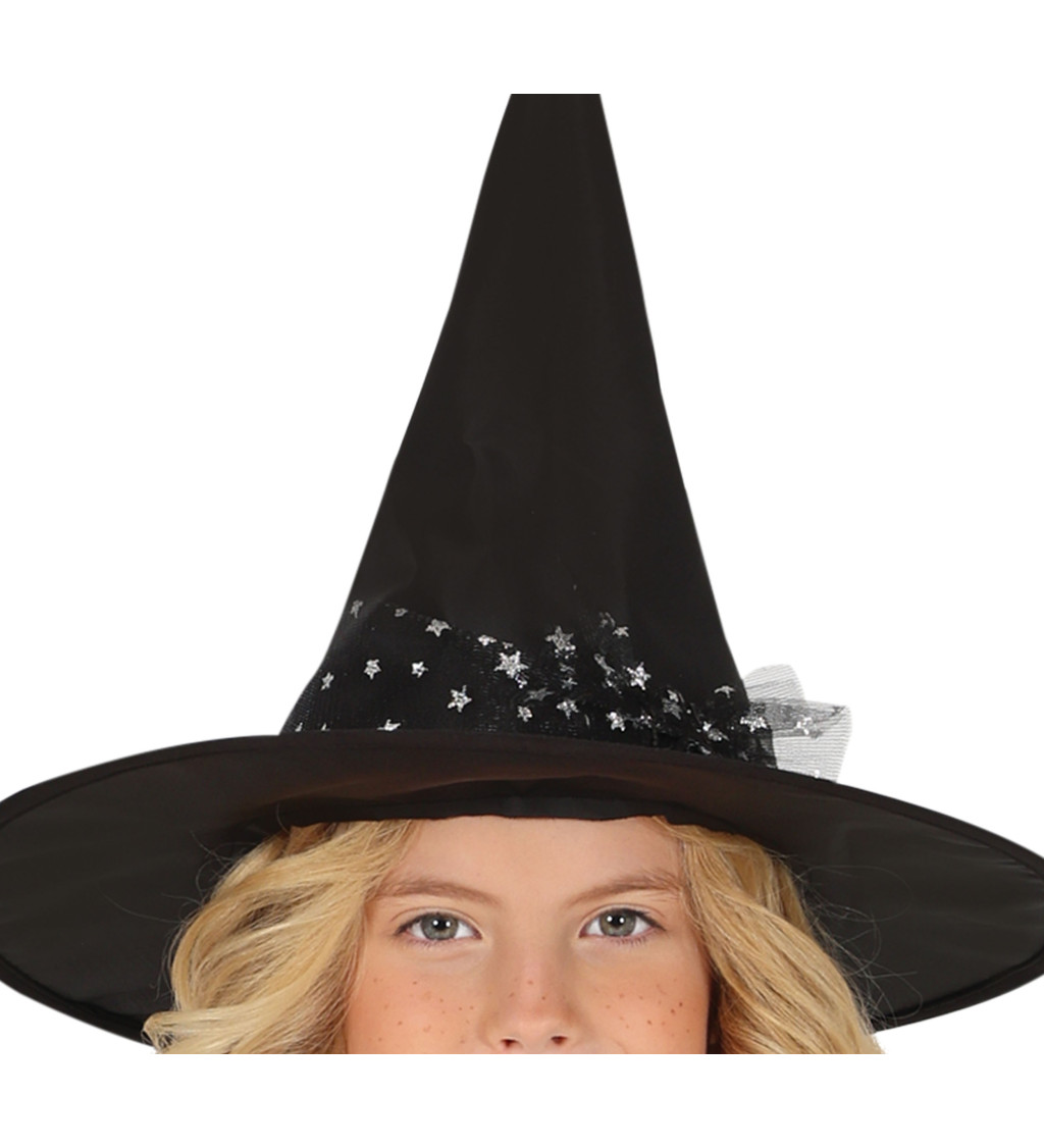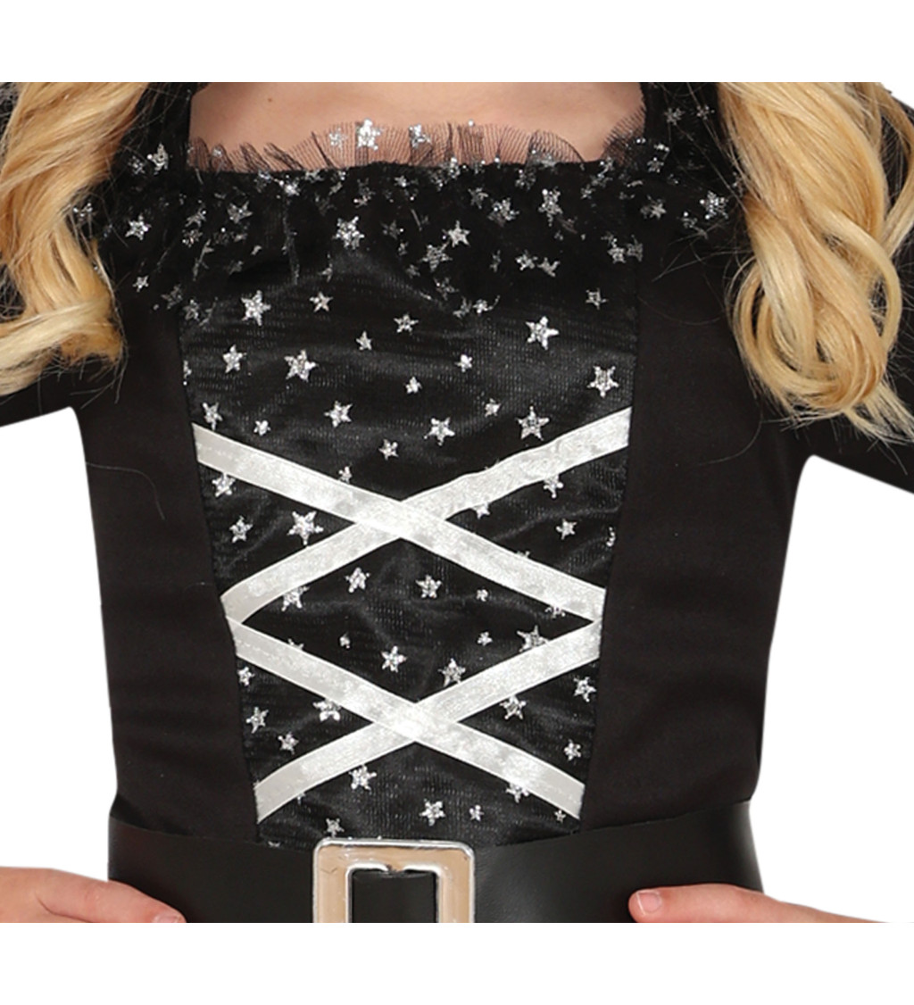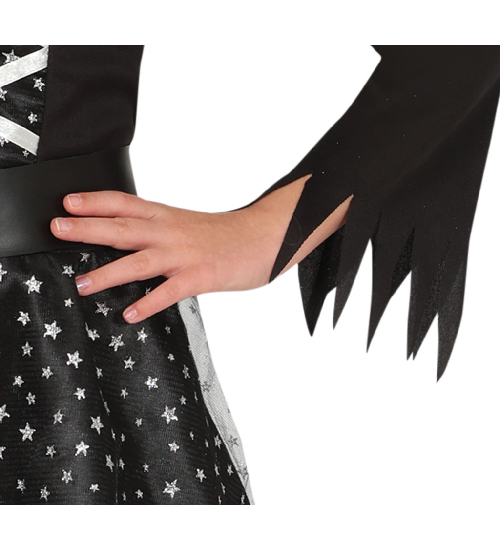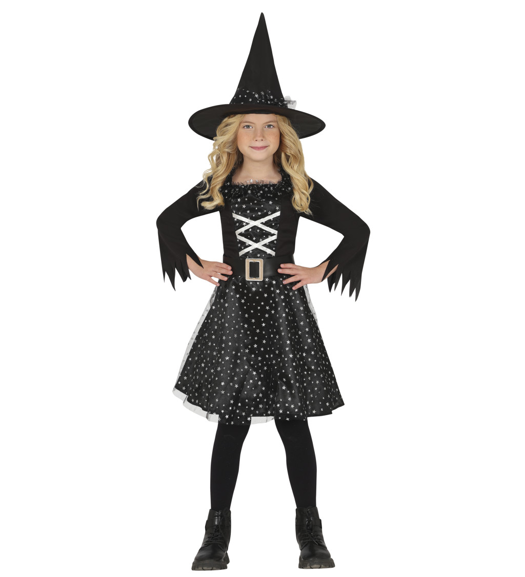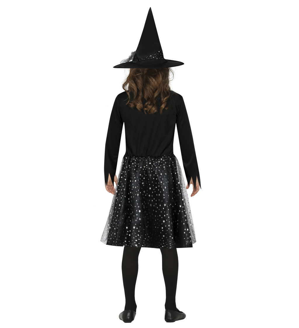 Černé šaty se zlatými hvězdami a ikonický klobouk dodají magický vzhled, který okouzlí na Halloweenu i karnevalu.